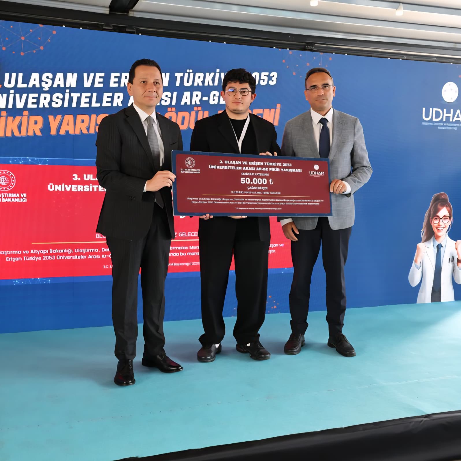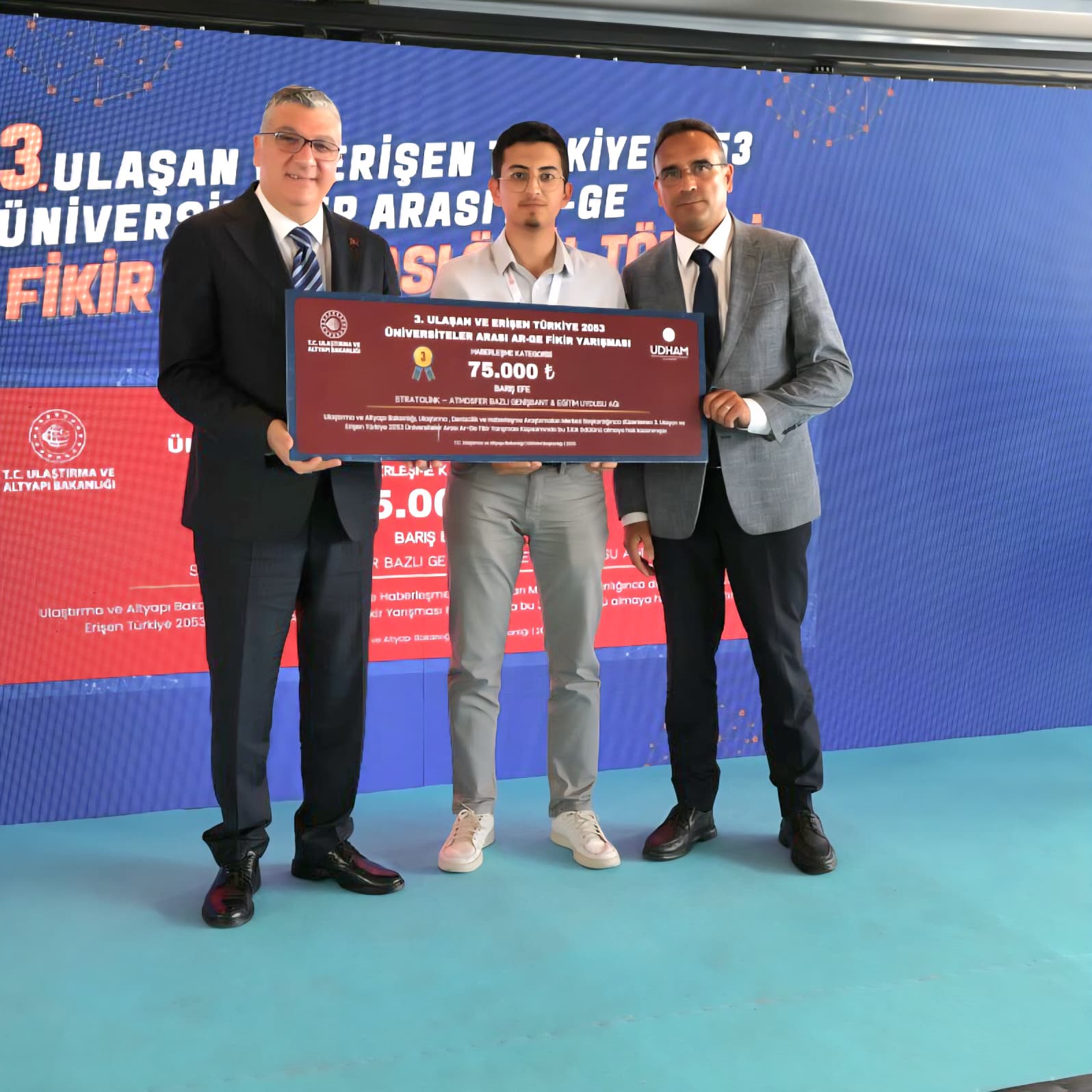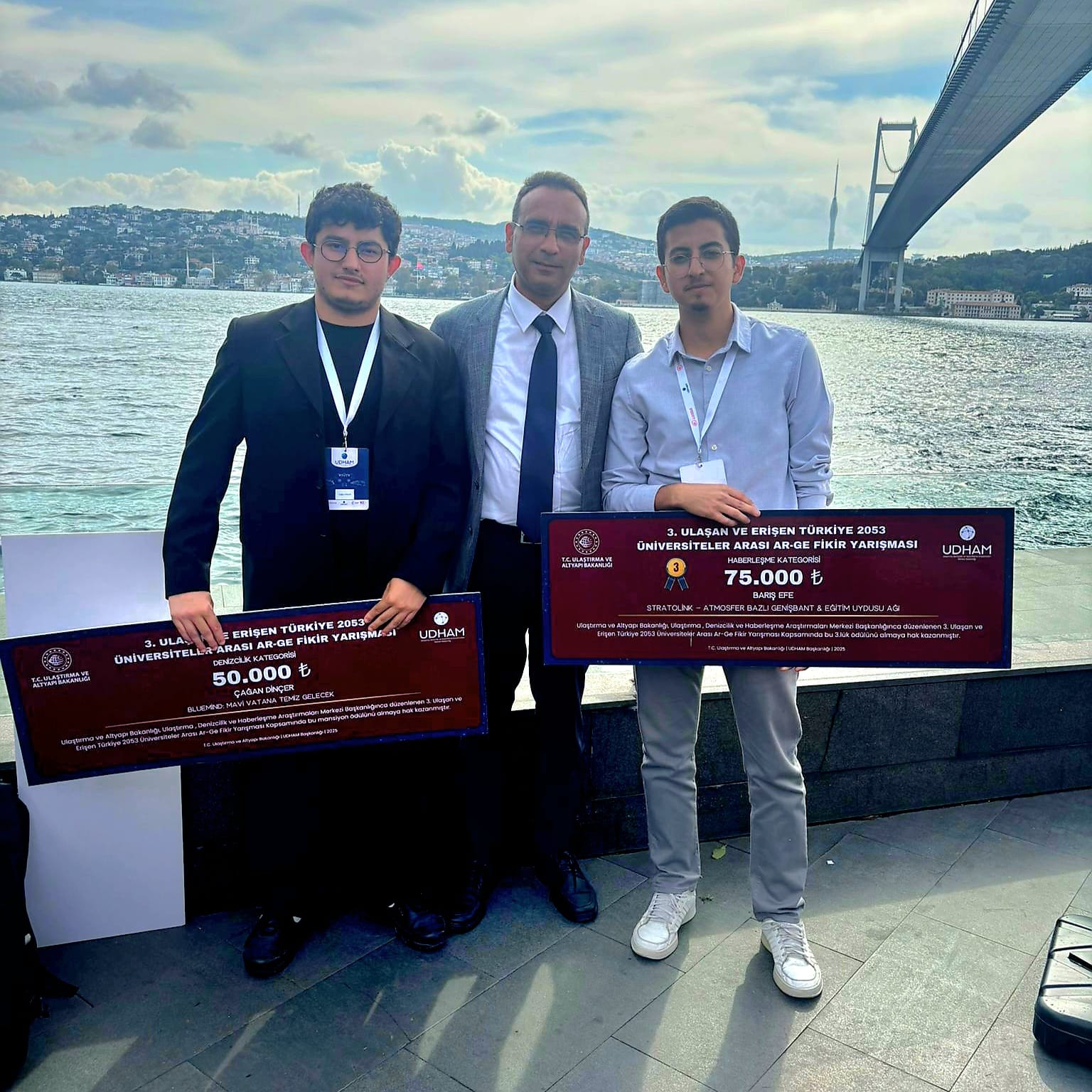 İstanbul'da yapılan ödül törenine öğrencilerimiz Barış Efe ve Çağan Dinçer'le beraber rektör yardımcımız Sayın Prof. Dr. Hakan Demiral' da katılım gösterdi. Kazanan projelere ödülleri Ulaştırma ve Altyapı Bakanı Abdulkadir Uraloğlu tarafından bizzat teslim edildi. Ulaştırma ve Altyapı Bakanı Abdulkadir Uraloğlu rektör yardımcımız Sayın Prof. Dr. Hakan Demiral ve öğrencilerimize bizzat teşekkür ederek katılımlarının devamlılığı konusunda teşvik için konuşmalarda bulundu.